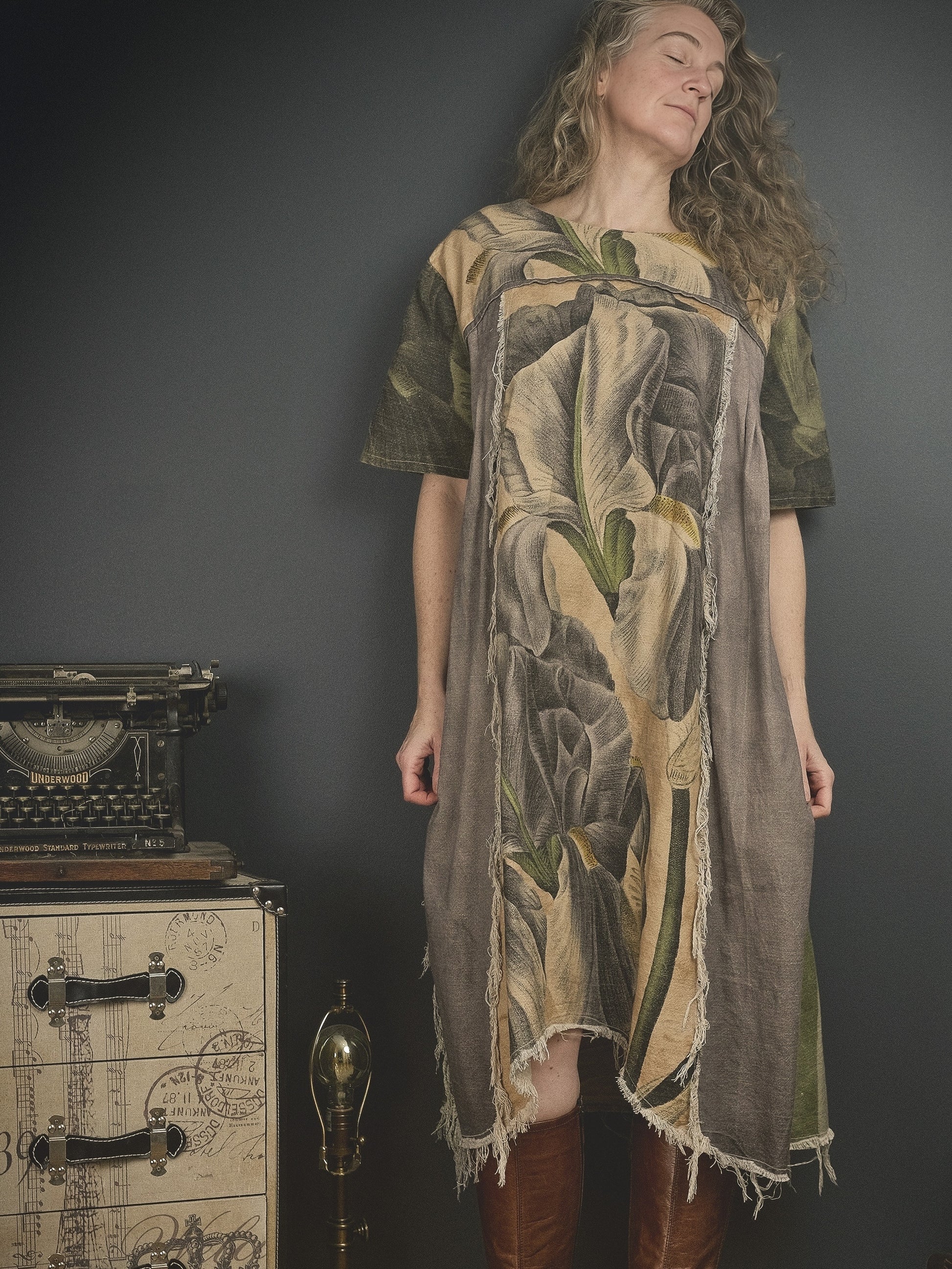 This made-to-order high quality, limited edition dress features a mid-weight, buttery soft, natural cotton/linen blend with distressed and frayed seams, printed with an over-sized 19th century botanical illustration of 'Iris x Germanica' or 'Bearded Iris', an old rhizomatous perennial that is thought to have evolved in the Mediterranean.