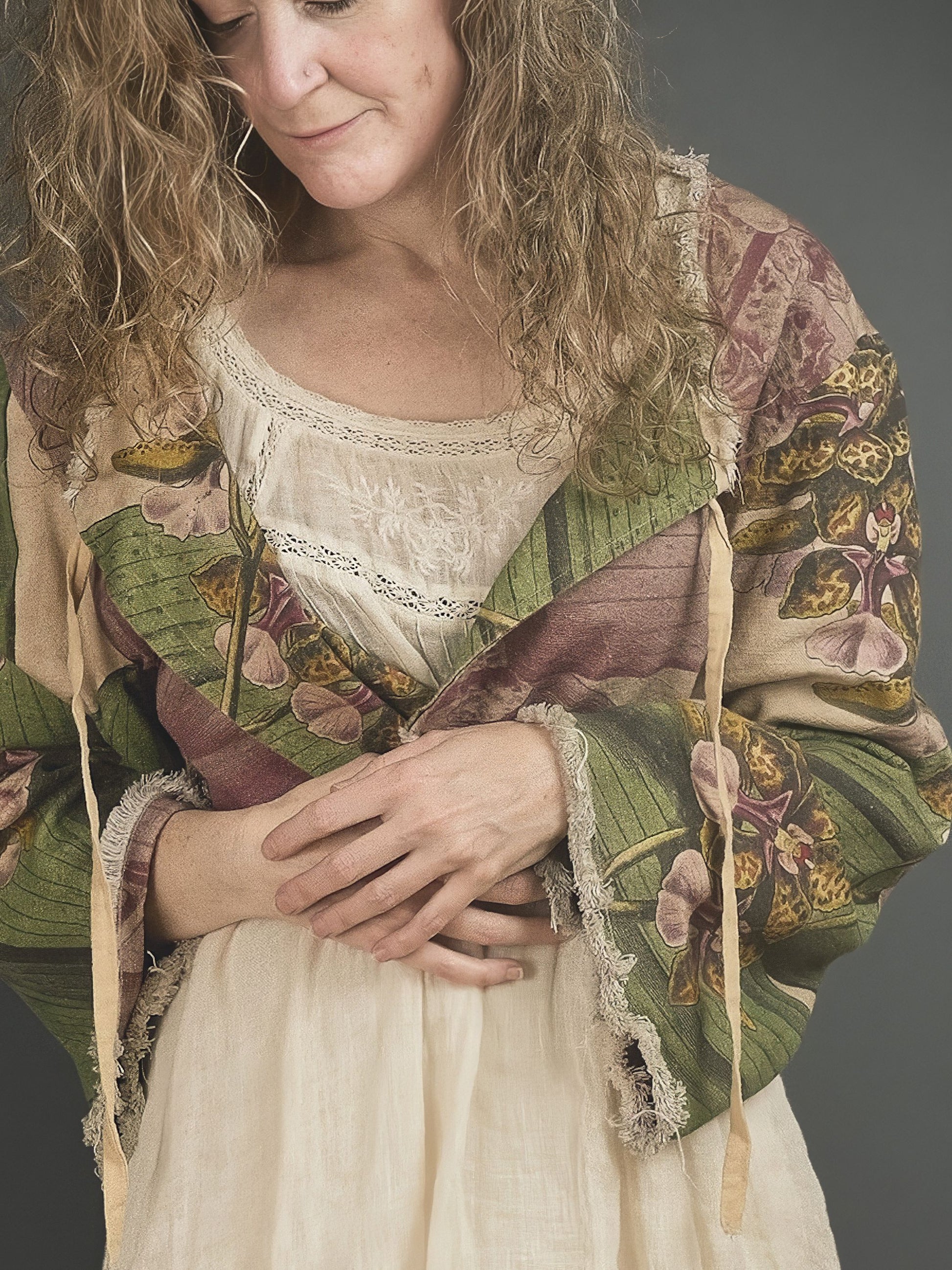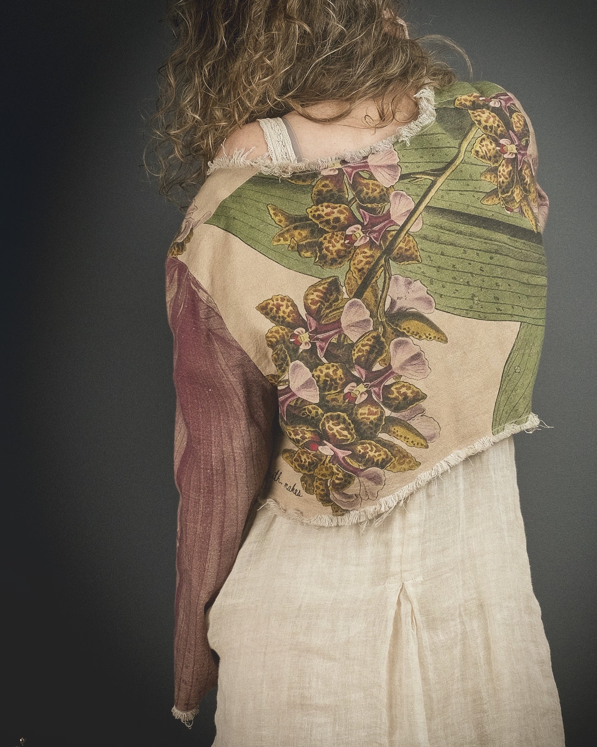 This made-to-order high quality, fully-reversible jacket features a mid-weight, buttery soft natural cotton/linen blend with distressed and frayed seams, printed with an over-sized 19th century botanical illustration of the Tropical Orchid "Oncidium Lanceanum”, a fragrant orchid native to a number of Central American countries.